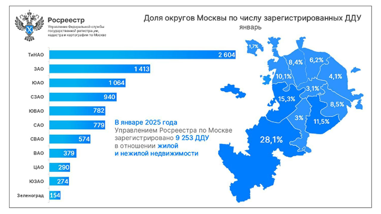 «Управлением Росреестра по Москве подведены итоги января 2025 года среди административных округов столицы по количеству зарегистрированных договоров долевого участия на рынке жилой и нежилой недвижимости. Новая Москва традиционно возглавила рейтинг с показателем 2 604 ДДУ, что составило 28,1% от общего числа оформленных первичных сделок в Москве за месяц (9 253 ДДУ)», – говорится в сообщении.